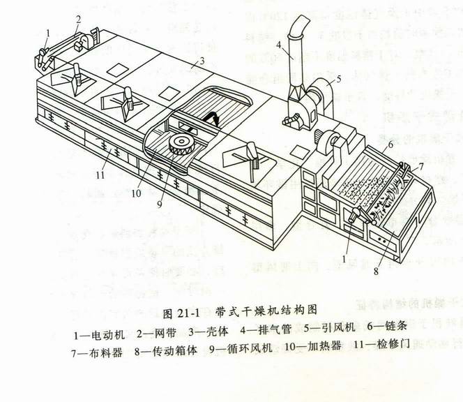 帶式干燥機按其構造及氣體作用方法分成兩種主要形式:具有無孔帶的干燥機與具有網狀帶的干燥機。第一種干燥機的帶由織物(如帆布、橡膠帶、涂膠布等)制成。載熱體(通常是熱空氣)掠過均勻鋪在帶上的被干燥物料層的上方。其流動方向與帶的運動方向相反為逆流,相同則為并流。